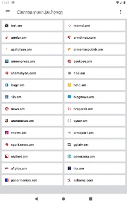 Appen fungerer som et intelligent katalog over betroede nyhedskilder, herunder anerkendte navne som News.am, Azatutyun.am, Tert.am og 1in.am. Vælg din foretrukne kilde fra listen, og dyk direkte ned i dens specifikke nyhedsstrøm, uden forstyrrelser fra andre udbydere. Dette sikrer, at du altid læser præcis det, du har valgt. Uanset om din interesse ligger inden for politik med den seneste grænsesituation og regeringsbeslutninger, økonomi med aktuelle valutakurser og banknyt, sportsresultater fra fodbold til skak, vigtige samfundsanliggender eller de seneste opdateringer fra showbusiness, leverer *Armenia Today* dybdegående dækning fra en bred vifte af emner.
